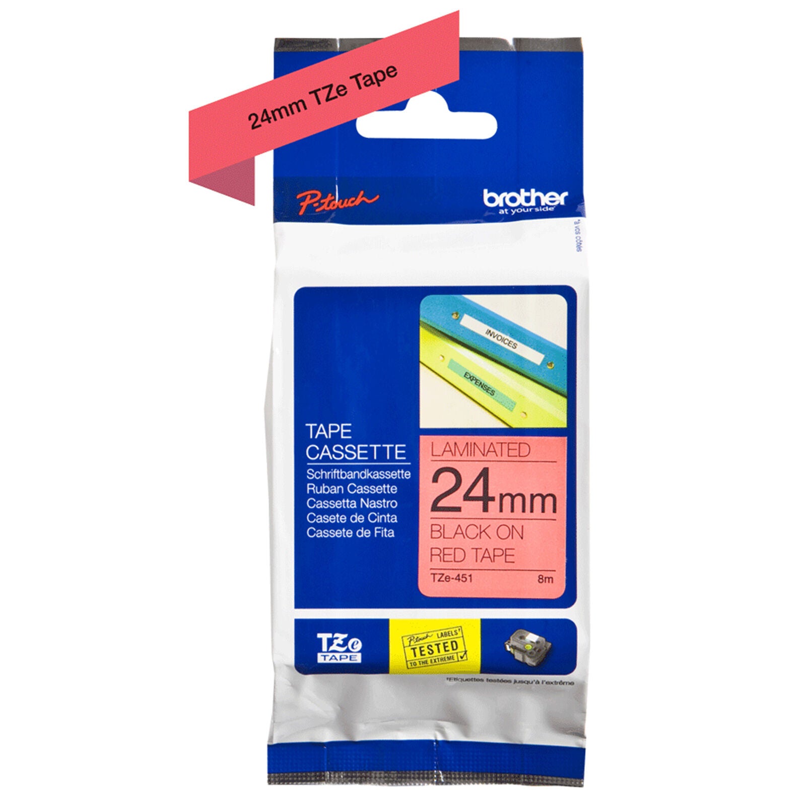 Genuine TZe-451 Labelling Tape – Black on Red (24mm x 8m) This genuine TZe-451 laminated tape features black text on a red background, offering a reliable solution for creating clear, easy-to-read labels in a range of environments—from home and office use to more rugged workplace settings. Engineered for durability, the tape is resistant to water, chemicals, UV light, and abrasion. Its laminated surface ensures labels remain legible and intact, even under harsh conditions. Compatible with a wide selection of Brother P-touch label printers, this 24mm wide tape is a trusted choice for labeling everything from files and shelves to cables and electronic devices. -24mm wide, 8m long -Genuine TZe laminated cassette -Designed for lasting clarity and adhesion -Suitable for indoor and outdoor use -Built to withstand tough conditions
